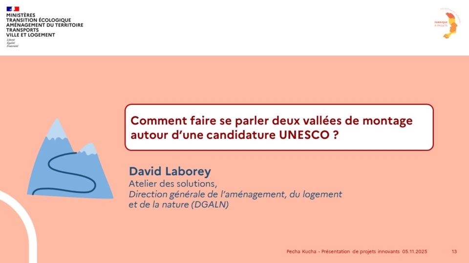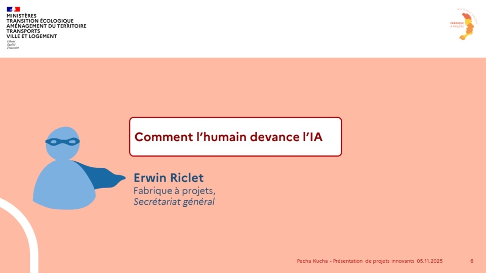 Le 05 novembre dernier, 8 agents des Ministères Transition écologique, Aménagement du territoire, Transports, Ville et Logement se sont prêtés au difficile exercice du Pecha Kucha : présenter un projet en 20 diapositives de 20 secondes. Pas facile de raconter toute la complexité d'un projet d'innovation en si peu de temps !