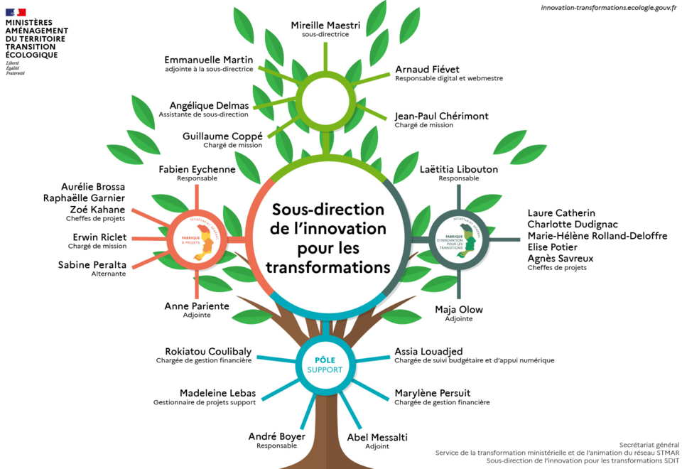 La sous-direction de l’innovation pour les transformations a été créée le 1er juillet 2023 et intégrée au Service de la transformation ministérielle et de l’animation du réseau STMAR du secrétariat général des ministères de l’Aménagement du territoire et de la Transition écologique.