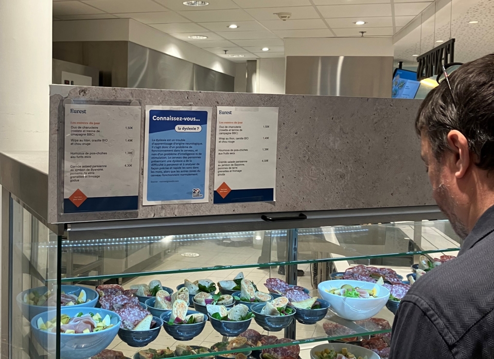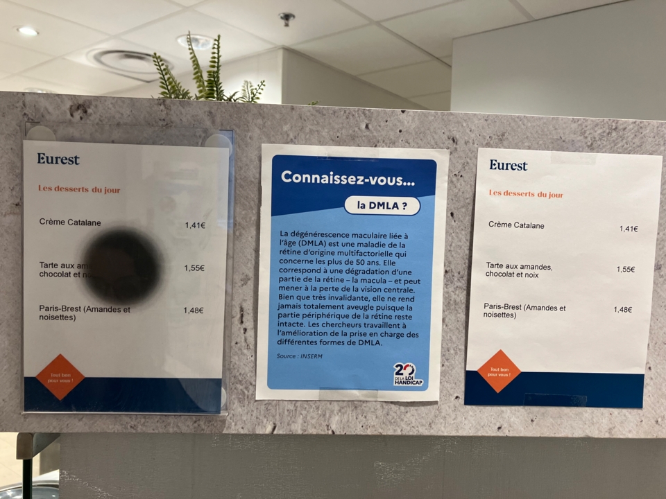 Dans le restaurant administratif de la tour séquoia, certains agents auront peut-être remarqué que les affichages des entrées et des desserts étaient un peu plus compliqués à lire... eh oui ! Ceux-ci simulaient des troubles visuels comme la DMLA, la dyslexie ou encore la cataracte.