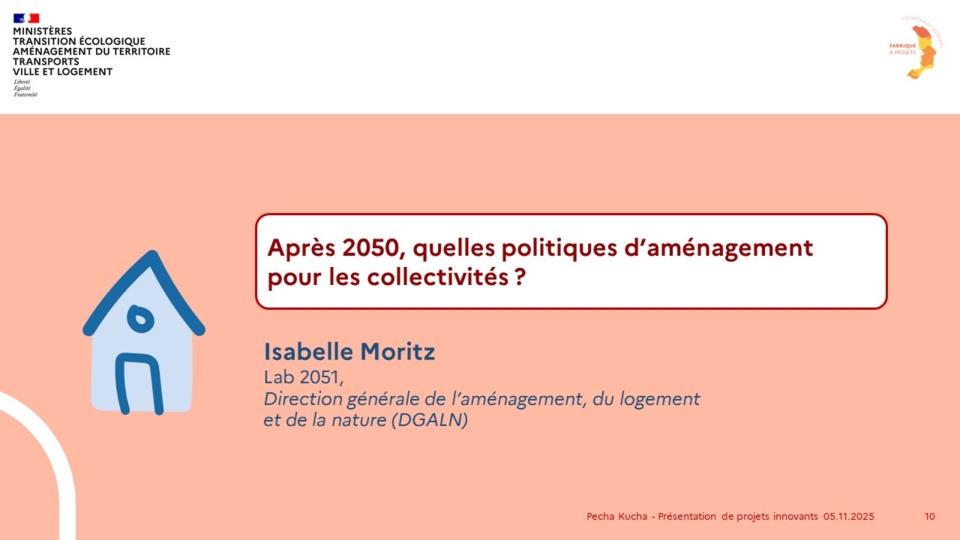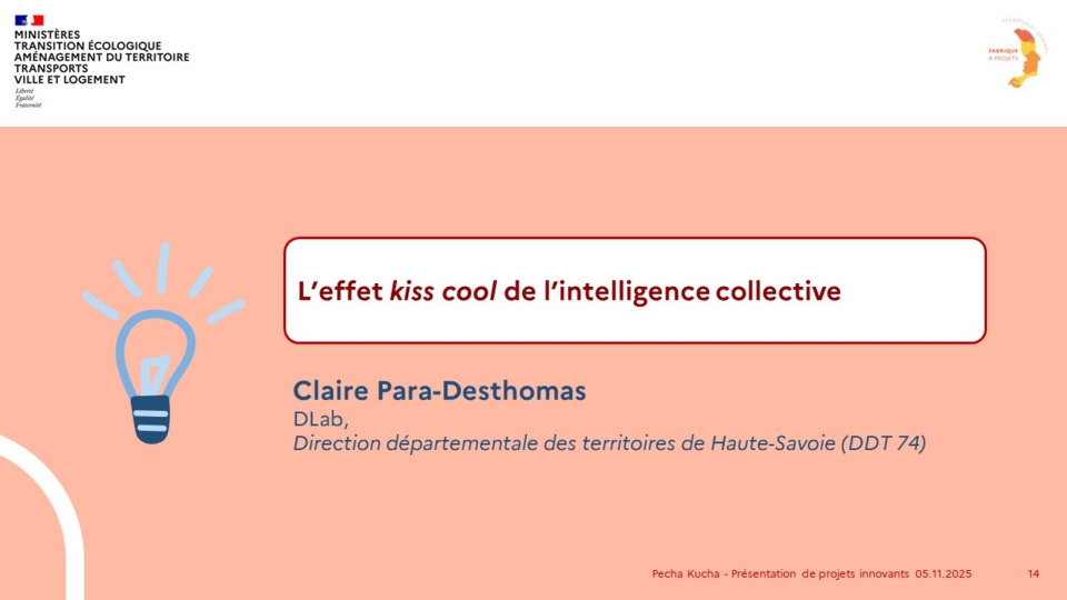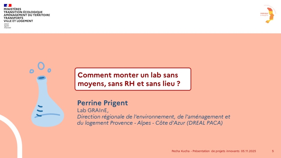 Le 05 novembre dernier, 8 agents des Ministères Transition écologique, Aménagement du territoire, Transports, Ville et Logement se sont prêtés au difficile exercice du Pecha Kucha : présenter un projet en 20 diapositives de 20 secondes. Pas facile de raconter toute la complexité d'un projet d'innovation en si peu de temps !