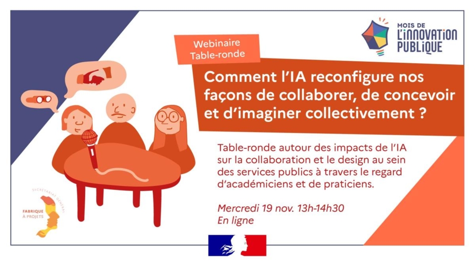 Ce webinaire, qui s’est tenu le 19 novembre dernier dans le cadre du Mois de l’innovation publique, a exploré la manière dont l’intelligence artificielle transforme les pratiques de design, de co-conception et d’intelligence collective. Chercheurs, designers et praticiens ont partagé leurs travaux, éclairant à la fois les potentiels créatifs de l’IA, ses apports méthodologiques et les enjeux éthiques et pratiques que son intégration soulève dans les dynamiques de groupe.